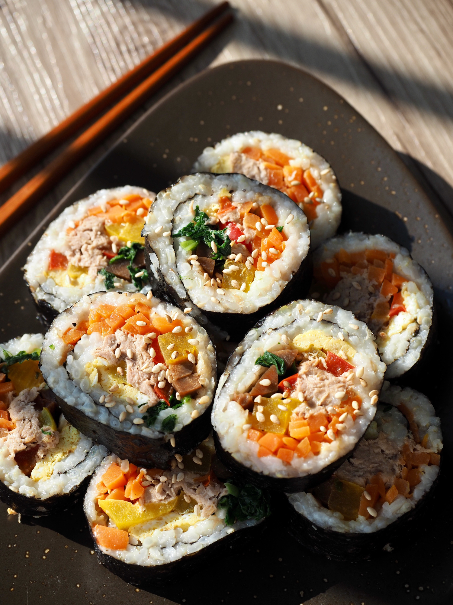 Con solo ver la presentación de este plato coreano cualquiera podría pensar que se trata de sushi. No obstante, existen bastantes diferencias respecto al popular plato japonés. El kimbap se presenta en rodajas más grandes, lo que además ayuda a incluir muchos más ingredientes. Se compone de arroz sazonado con sal y aceite de sésamo, al que se añaden productos como zanahorias, espinacas, huevo, rábanos encurtidos y, a menudo, carne o mariscos. Todo esto se enrolla con un alga seca (o gim) y se corta en rodajas, lo que hace que sea una receta perfecta para llevar o para disfrutar en un pícnic en el parque, muy en sintonía con los gustos coreanos.