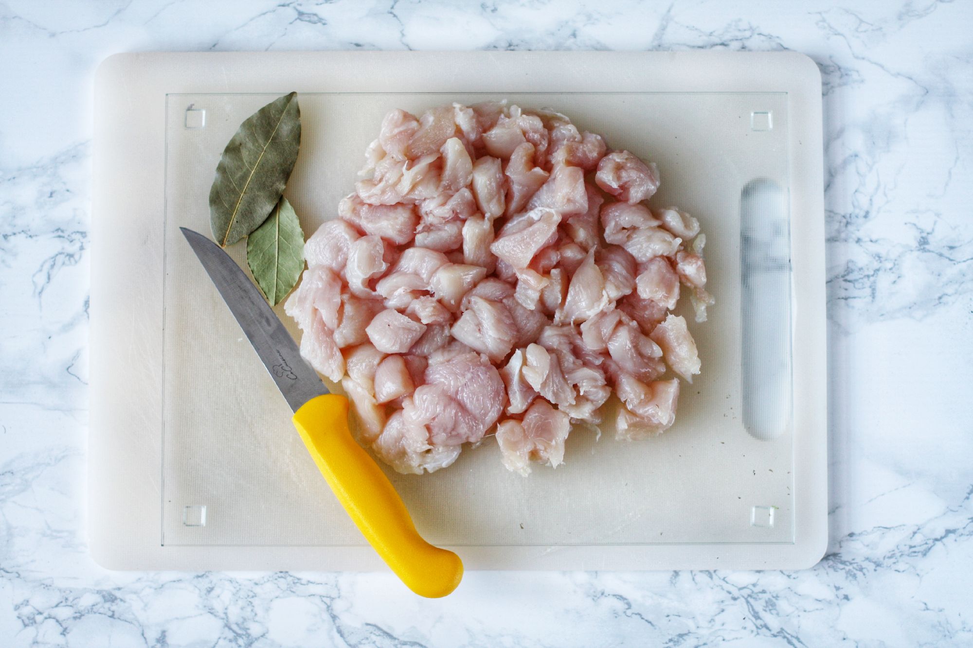 Para comenzar con nuestra receta, el primer paso es trocear en cuadraditos regulares y hervir la pechuga de pollo junto con unas hojas de laurel. Este proceso es esencial para lograr un pollo tierno y jugoso, además de darle una base de sabor delicada y aromática. El laurel aportará un toque herbal que realzará el perfil de la sopa sin sobrecargarla.