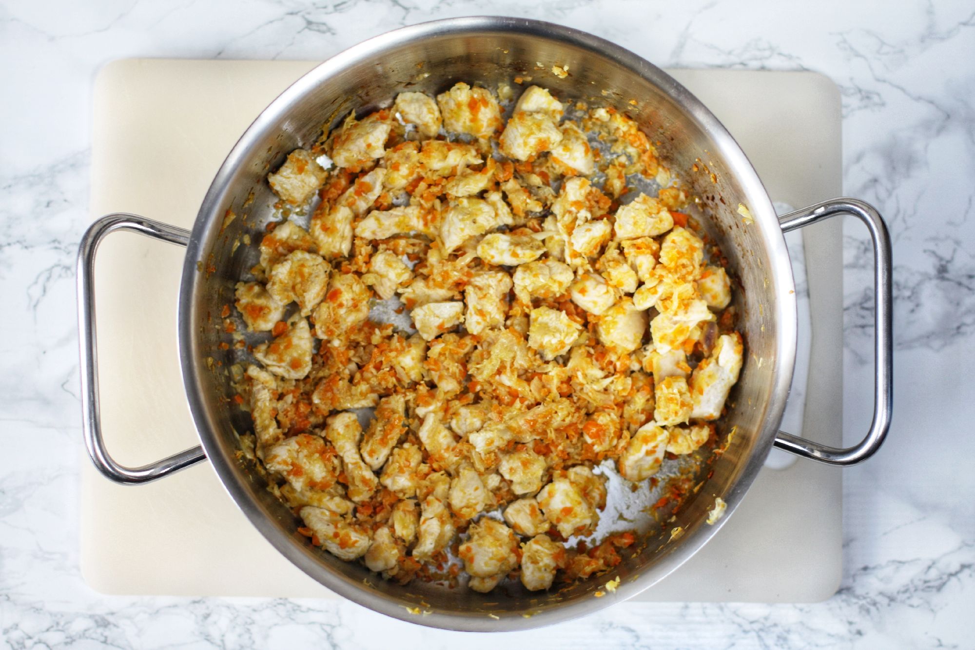 Para ello, pelamos y troceamos todas las verduras en cuadraditos pequeños y regulares. En una cazuela ponemos unas cucharadas de aceite y sofreímos la cebolla, el puerro, el ajo y las zanahorias hasta que estén todo hecho. Incorporamos el pollo escurrido, sal y pimienta al sofrito y removemos.