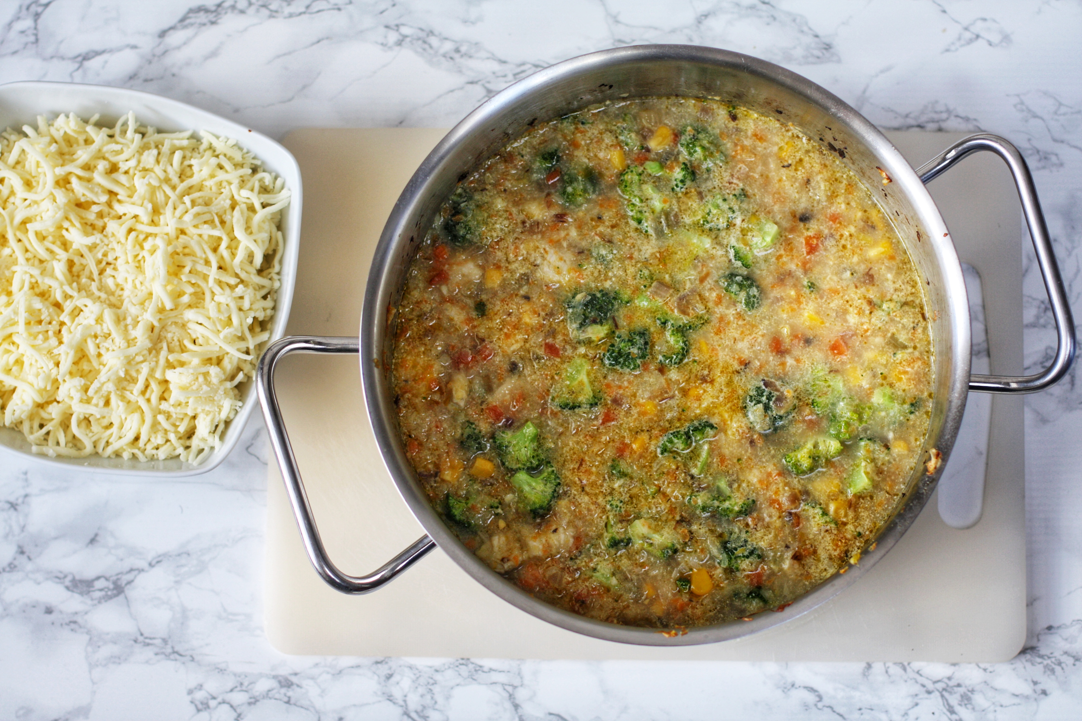 El toque final para lograr un chowder irresistiblemente cremoso es añadir el queso. Al incorporarlo a la mezcla de pollo y verduras, el queso se funde suavemente, otorgando una textura rica y suave que hará que cada cucharada sea deliciosa y reconfortante. Cocemos todo junto a fuego lento para que los sabores se fusionen perfectamente, creando una sopa cremosísima que es pura indulgencia.