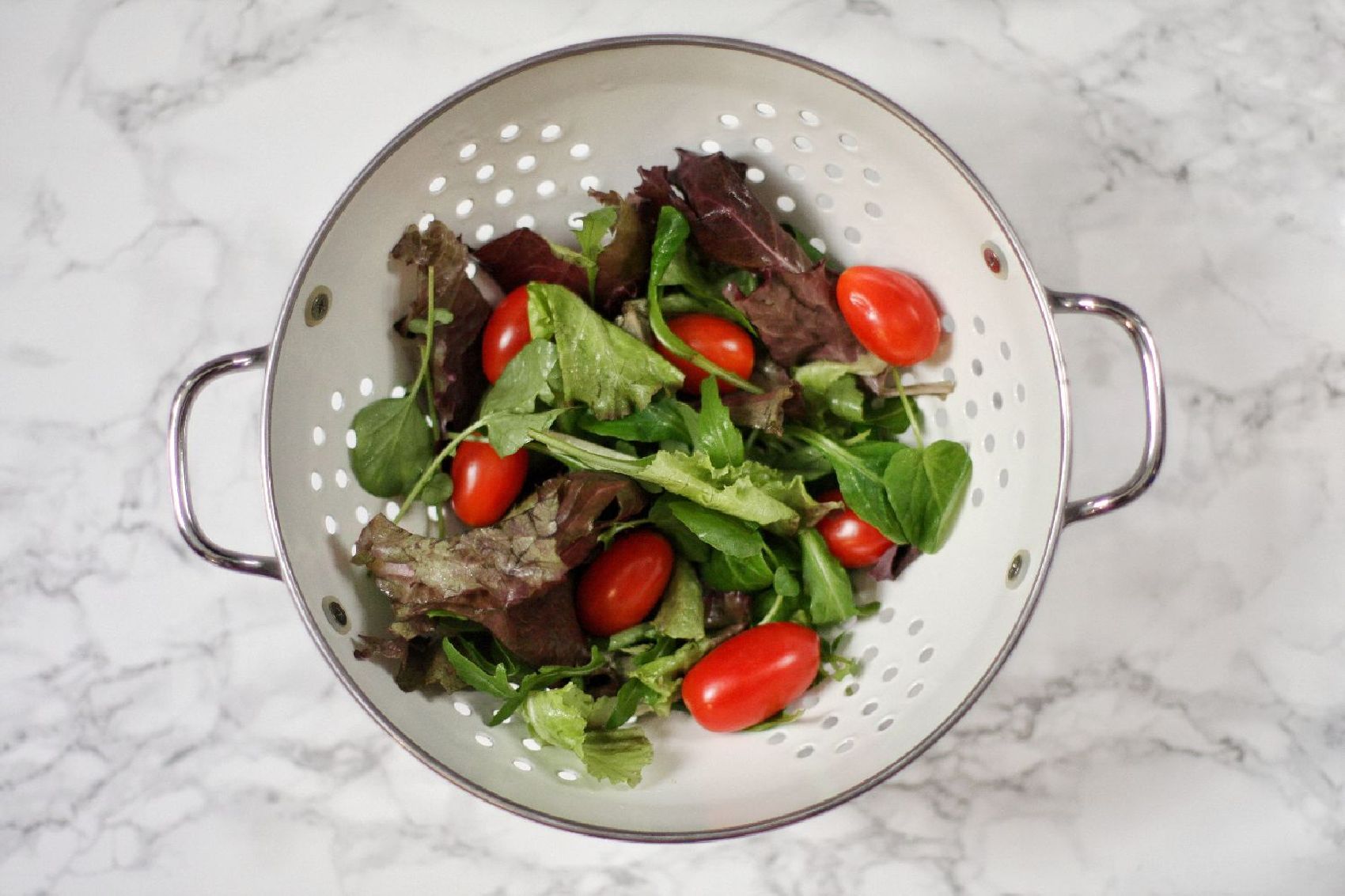 Las hojas de las lechugas deben lavarse y escurrirse bien, el agua las apelmaza y por eso es aconsejable utilizar un centrifugador que eliminará por completo el exceso de humedad. Los tomates deben lavarse, secarse y cortarse por la mitad, a lo largo. Los tomates cherry tienen el tamaño ideal de bocado para que no sea necesario partirlos más pequeños.