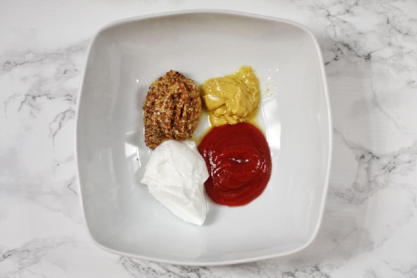 Necesitamos un recipiente hondo que nos permita batir los ingredientes para que queden bien integrados. En él pondremos el yogur griego, el ketchup y las dos mostazas. Para mezclarlos se puede usar una cuchara o un batidor y es importante que guardemos esta salsa en la nevera hasta el momento de servirla.