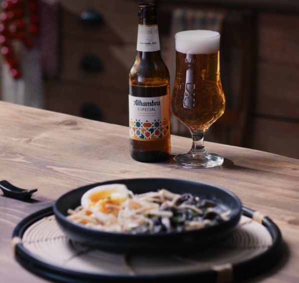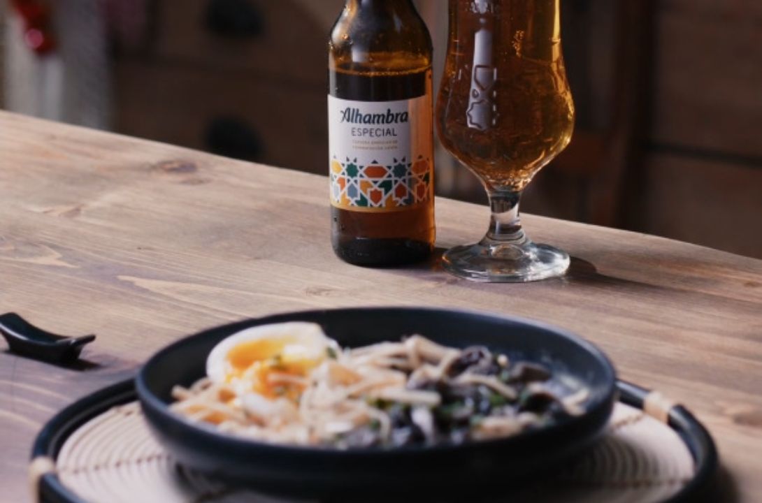 En Japón, los platos del día a día suelen acompañarse con cervezas suaves, brillantes y espumosas. Y nuestra lager por excelencia, Alhambra Especial, cumple a la perfección su cometido como mejor maridaje. Nos ofrece un amargor suave y ligeras notas afrutadas que permiten degustar el sabor de las shiitake y del cebollino en todo su esplendor. También ayuda a elevar la intensidad -y los toques salados- del miso, lo que hace de esta variedad una de las más recomendadas para recetas vegetarianas tan completas como el mazemen.