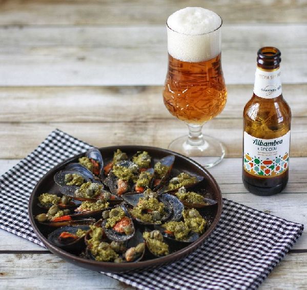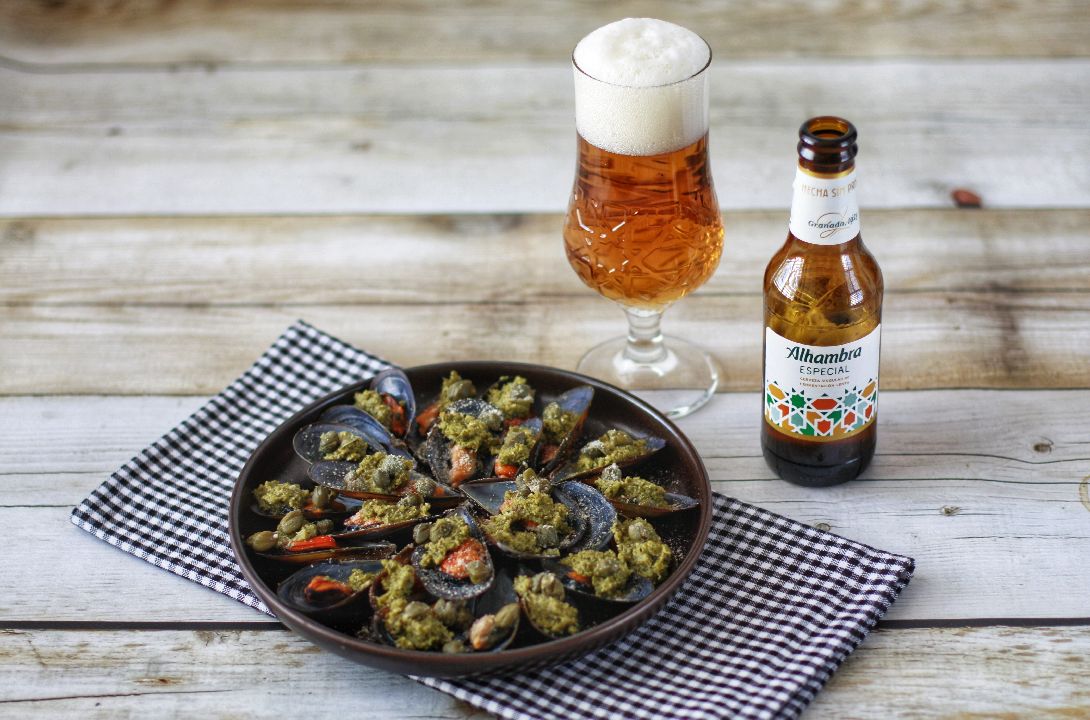 El maridaje de mejillones al pesto con Alhambra Especial es una combinación excelente que destaca por su equilibrio y complejidad. La cerveza Alhambra Especial, con su sabor suave, maltoso y notas de toques sutiles de lúpulo, complementa perfectamente el pesto, cuya intensidad y frescura de albahaca y piñones resalta sin sobrepasar el paladar.