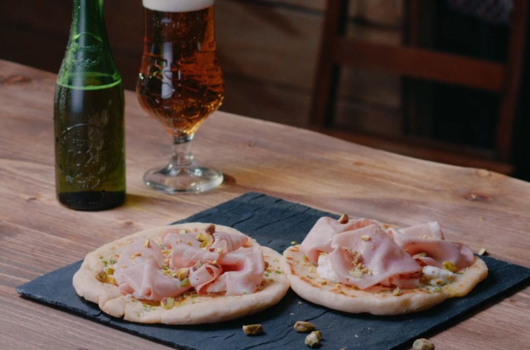Aperitivos como los frutos secos son el territorio por excelencia para un maridaje como Alhambra Reserva 1925. Pero es también la ligereza y equilibrio del pan naan, la mortadela y la burrata la que hará que esta combinación de sabores se quede durante mucho tiempo en nuestro paladar. A través de esta receta con mortadela trufada, que también puedes intercambiar por mortadela italiana, descubriremos los lúpulos florales de la variedad más icónica de Cervezas Alhambra. Y, por supuesto, nos adentraremos en su amargor moderado, que tan bien funciona con los contrastes dulces y salados de esta elaboración.